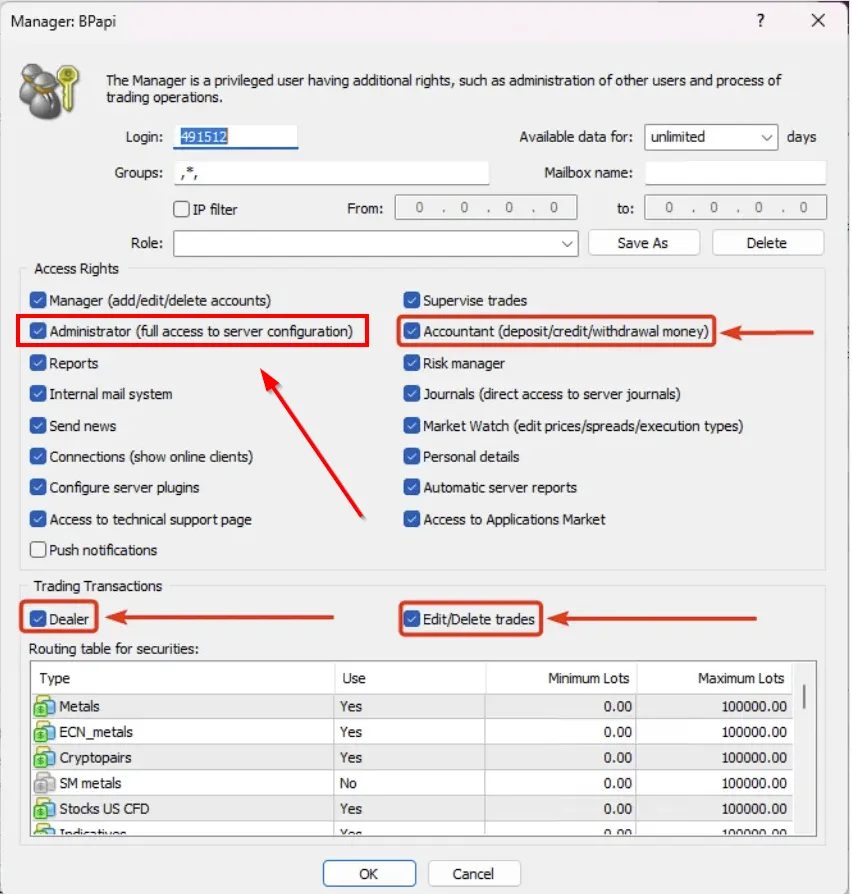 This section allows brokers to process dividend payments for traders holding open CFD positions. Brokers can apply dividends either to a specific trade server or, if operating multiple servers, to all orders across multiple trade servers. Traders can also be notified about dividend payments through push notifications in instant messaging apps.