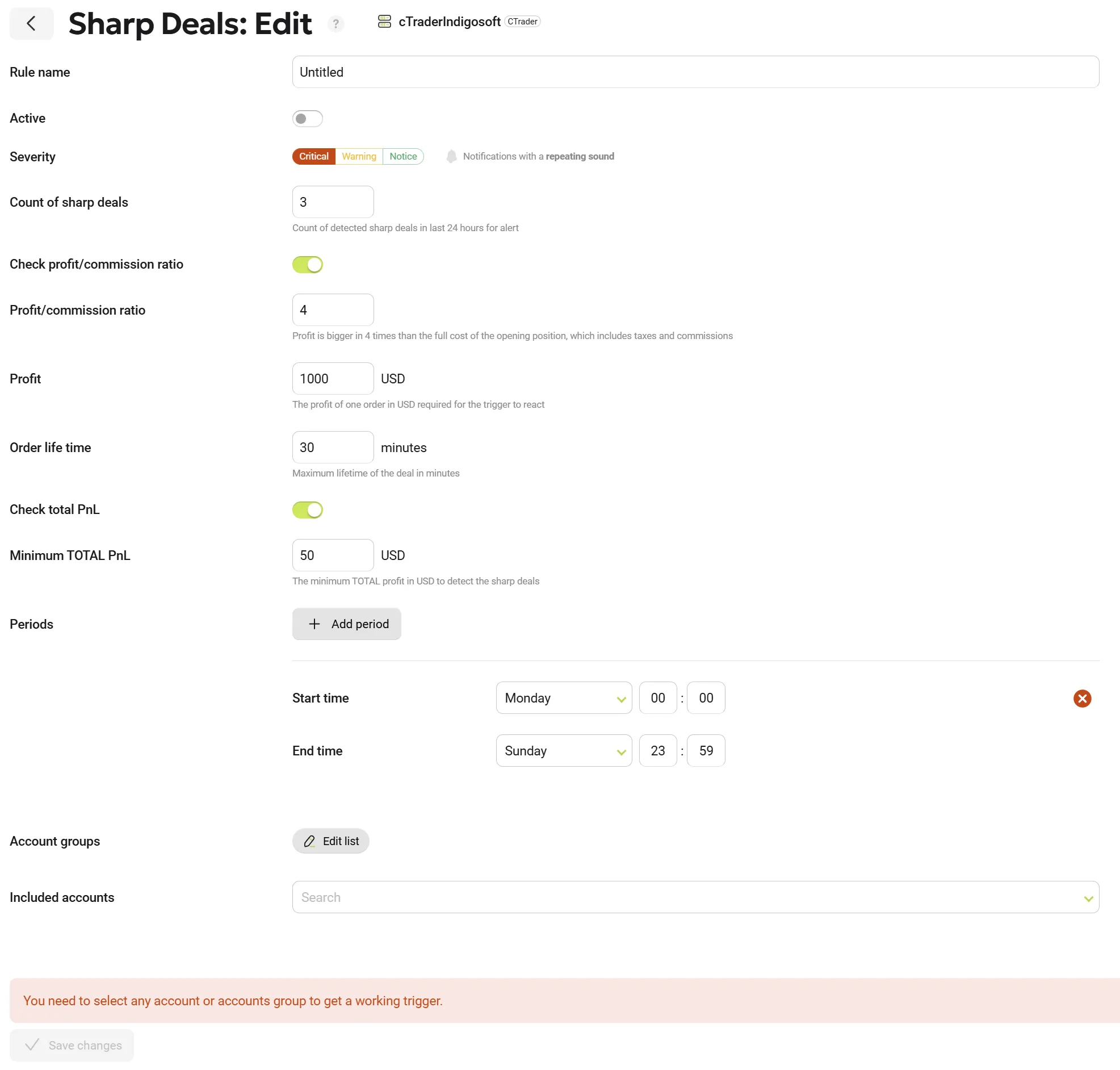 ✅ If the number of successful transactions in the current session equals or exceeds the Count of Sharp Deals setting, the trigger generates a notification with details of the detected transactions and the corresponding accounts.