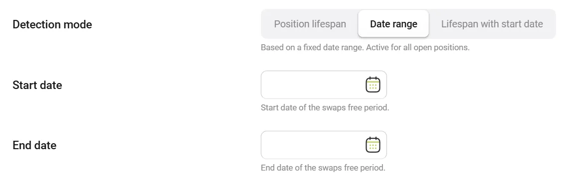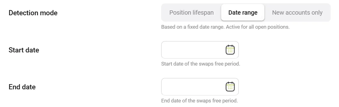 Mode 2 (Date Range): Position is swap-free during the calendar period, regardless of open time.
