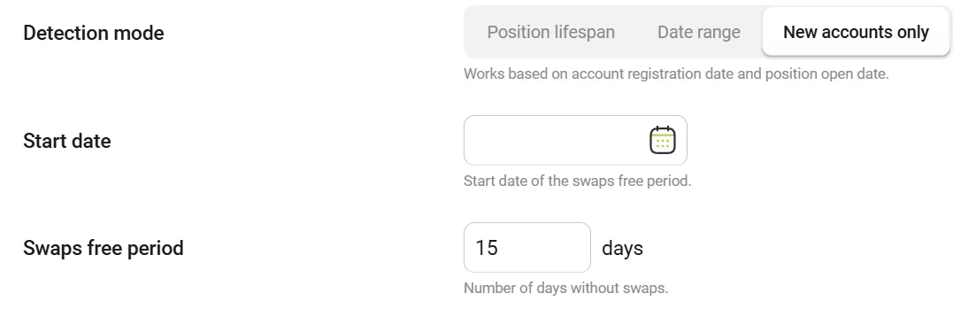 Description: Only accounts registered after a specific date get swap-free conditions, with each position receiving a fixed number of swap-free days.