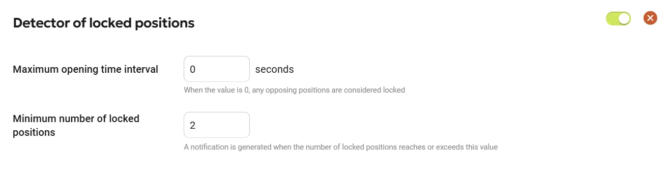 A notification is generated every time an account places locked positions with a time interval shorter than specified in the settings.