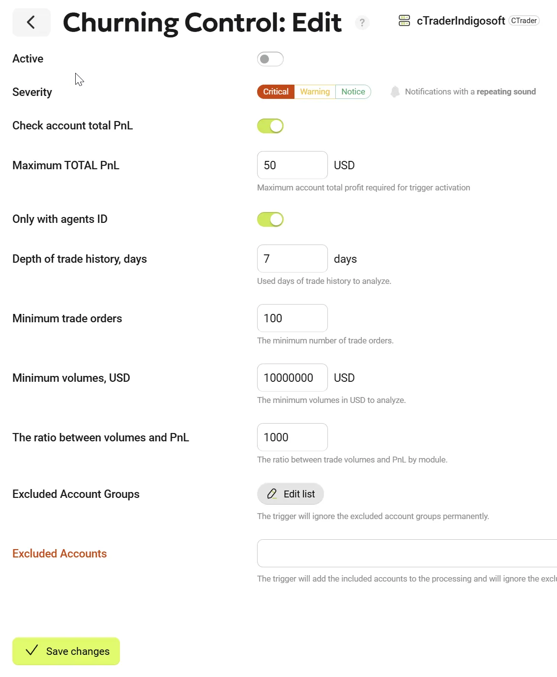 - Ratio of PnL to total volume (if this ratio exceeds the specified value, a notification is generated).
